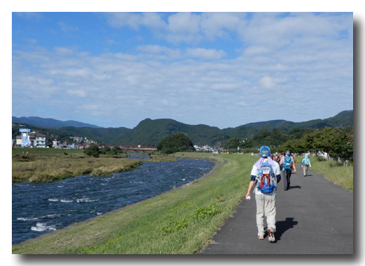 今年からの狩野川右岸堤は左岸堤とは違った景色だ。う〜ん、右岸堤の方がいいね〜 集団の中から歓声が上がった。東静歩こう会ではウオーキング世界大会の「オランダナイメーヘンフォーデーマーチ」に昨年の100回大会まで毎年参加していて、ライン川堤や運河堤の景色やその歴史・規模・は素晴らしく毎年感動していた。このコースの景色もライン川堤に匹敵する景色だ。伊豆のライン川である。京浜地区の参加者から、ここはラインとは違うすばらしさがある、川のそばに低山が連なっていること、正面に富士山が見えることが最高だね。と言われ主催者としてうれしかった。ただし、残念ながら今日は晴れているのに富士山だけが雲の中である。