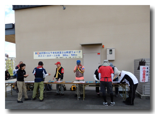 16時50分ゴールした。ゴールの番号札をいただく。すでに4人ゴールしていた。完歩者は疲労あるも、目標を成し遂げた達成感みなぎる素晴らしい表情だ。ゴール地点は東海道一の富士山眺望地点であるが、富士山の頂上は雲に隠れてずっと見ることが出来なかったのが残念であった。