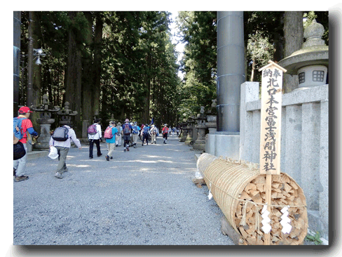 会長挨拶、担当幹事の長山さんのコース説明河口湖歩こう会2名、河口湖ウオーキング協会1名の紹介があり準備体操を行って、最初の目的地、北口本宮富士浅間神社に向かって出発。