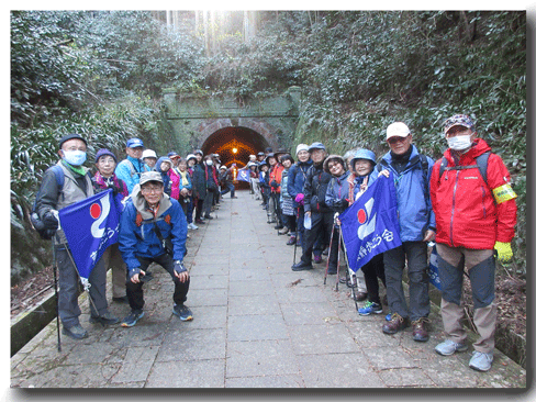 昼食後、明治のトンネルへ向かった。明治のトンネルは開通時長さ224m。日本初有料トンネルが完成。当時は「く」の字に曲がっていたそうです。手彫りで壁はレンガであった。