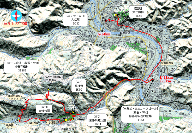 | ■■コース | [Aコース]14km 修善寺駅西口広場(出発式・トイレ・H:54)⇒修善寺橋⇒修禅寺(トイレ・H:95)⇒修善寺梅林(C合流・トイレ・H:188)⇒梅林駐車場(H:248)⇒ 紙谷橋⇒桂川右岸⇒いろは道⇒赤蛙公園(トイレ)⇒独鈷の湯公園(トイレ)⇒修善寺橋⇒修善寺駅西口(B,Cゴール・昼食・トイレ)⇒狩野川右岸⇒白坂踏切⇒大仁梅林(鑑賞H:58)⇒大仁駅(終了式・トイレ・ H:32) |