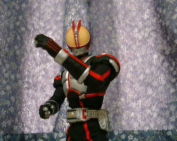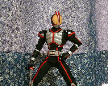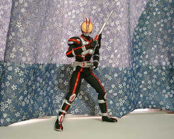 現在、放映中の仮面ライダーファイズから主役のファイズです。 アクセルフォームを分解、素体くんの不具合を改良して作りましたが、まだ足の可動範囲が狭いです(^^ゞ 手足のフォトンストリーム(ライン)はレッドの反射テープなので、光に当てると反射して光ります。 なお、手の指と足の裏はリペイント、ファイズ・エッジもどきはクウガのものです。 BACK TOP NEXT