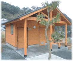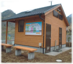 背面に浄化槽につながる出入り口が二つ設けられています。点検管理の時以外は施錠され、立ち入ることは出来ません。側面にバイオマス・トイレのしくみについて案内板が取り付けられています。芝生の上にある白い丸は、屋根の雨水を付近側溝に流すためのものです。