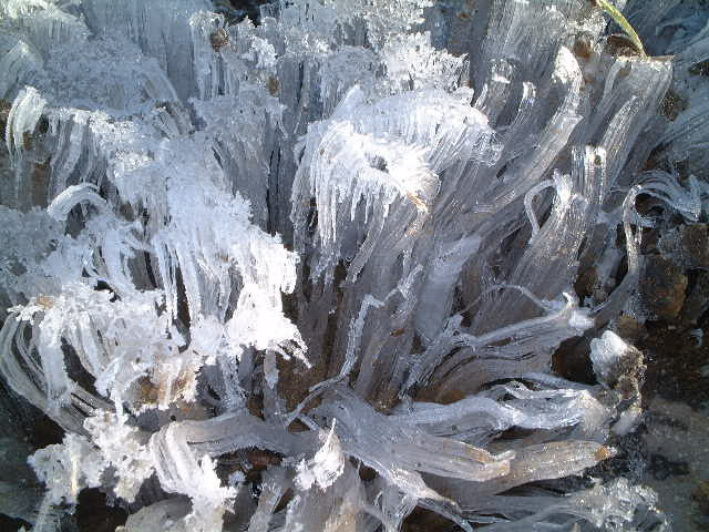 本栖湖の霜柱。5〜7cm,長いものは10cmくらいあるかもしれない。こんなに長い霜柱はあまりお目にかかれない。湖岸は軽い火山レキの砂利浜なので,この霜柱に持ち上げられて,歩くとさくさくと音を立てる。先端は氷の花だ。