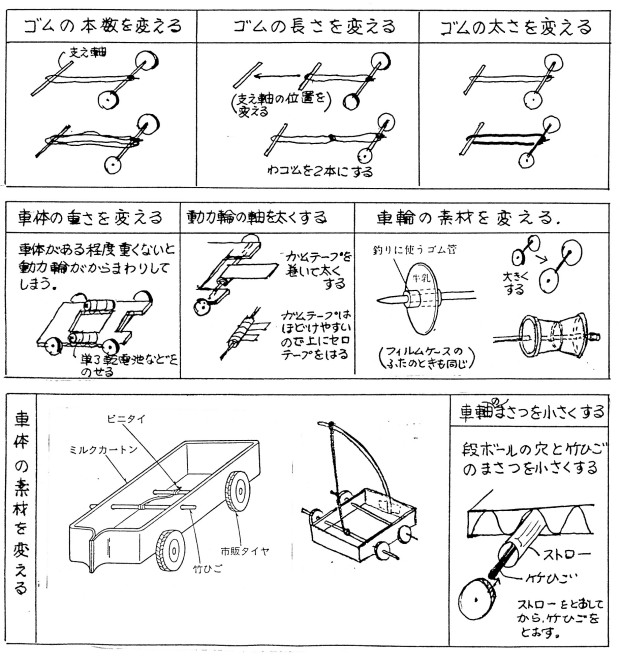 ゴムの太さや長さによって、車軸をまわす強さや、時間が変わることに気付く。 |