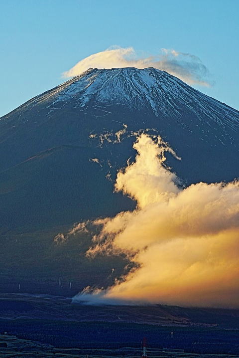 | 2025年11月1日 富士に昇竜 11月最初の富士山ですが、再び冠雪し山頂が少しだけ白くなりました。 夕方、夕陽を浴びた雲が昇り竜みたいに山麓から山頂に向けて駆け上がっていました。 龍神様に11月も災害のなきように祈りました。 撮影地: 御殿場市神山平 撮影時間:16:30頃 |