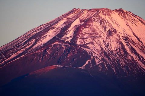 | 2025年11月12日 薄紅色に染まる宝永火口 今朝は冷え込み、放射冷却で富士山が薄紅色に染まりました。 宝永火口は、今から312年前のの宝永噴火で形成されました。 この火口を見るたびに富士山が火山であることを認識できます。 撮影地:御殿場市神山平 |