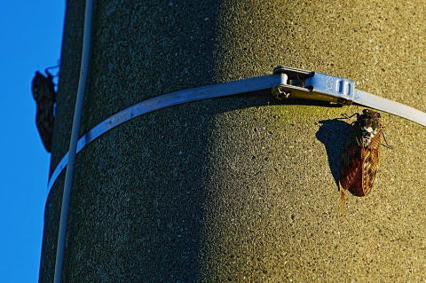 | 2025年8月28日 「静けさや・・にしみいる」 猛暑でなかなか富士山が見えませんので、珍しい情景を。 なんと電柱にセミが止まっていました。 もし、芭蕉がタイプスリップして、これをみたらどういう句になるのかと、思ったりして。 撮影地:御殿場市神山 |