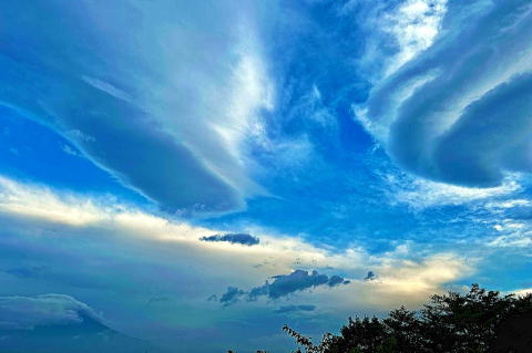 | 2025年8月7日 富士山上空の怪しい雲 早朝、富士山上空に板状の雲と半渦巻状の雲が現れました。 大地震の前兆でなければいいのですが。 撮影地:御殿場市神山 |