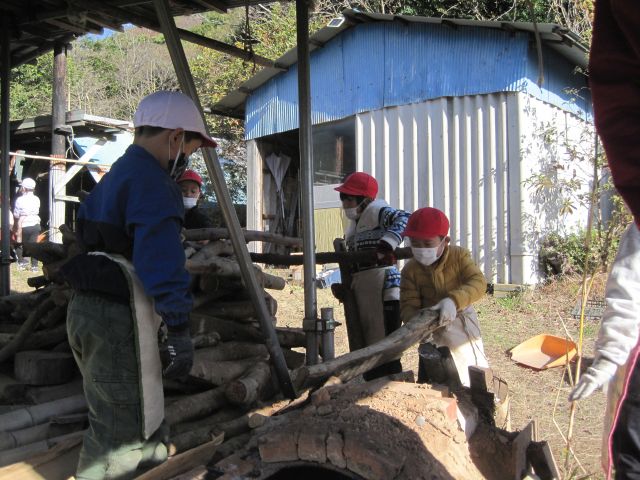 炭焼、炭焼窯造り、小学生の炭焼体験風景、炭焼窯の周りの里山風景、