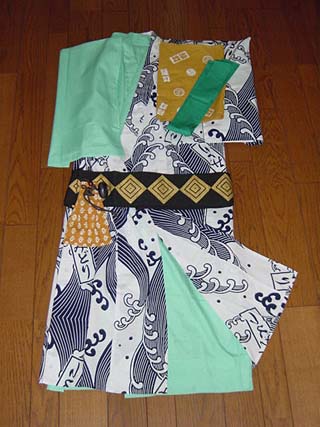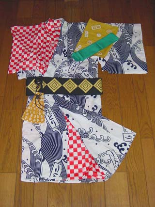 緑町の今年の衣装 男性は上の写真(長襦袢が緑色) 女性は右の写真(長襦袢が赤の市松模様) 今年(平成14年)の緑町の衣装は正装のゆかたを着用します。 男性は6年前に作ったものと同様の色目のもの。 女性は12年前に作ったものと同様の色目のものです。 たすきはこれまでのものよりも細く・短いタイプのものにし、色落ちのしない生地で作成しました。 手ぬぐいも新デザインに変更!緑町のセンスあふれる有志によって、とってもカッコいいデザインの手ぬぐいが完成しました!円く“緑”と書かれた文字は「ぼたん文字」という特殊な文字なのだそうです。この「緑」の文字は、山車の幕にも印字されていますので、ぜひご覧ください。 私の火の用心袋は個人で購入したものですので、雀の模様になっていますが、普通は「火の用心」と書かれた布製や皮製の袋を腰に着けています。 さて、ここで紹介したのはあくまで基本形(?)です。各町内会&個人はどうやったら目立つのか・粋なのかを色々と考え、鈴を付けてみたり、花笠を背負ってみたりとバリエーションを考えています。衣装一つとっても、お祭りを楽しもう!という気持ち伝わってきます。 |