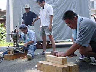 ある暑ぅ〜い夏の日における山車集中工事風景。 集中工事をするの緑町下方部(しゃぎり会)の方々です。工事用の図面作成、木材などの材料購入はもちろん、角材の切断やほぞ穴作成なども全て会員の手作業によって行われました。本業でこういったお仕事をされている方はいないのですが、みなさん本当に器用で感服いたしました。 炎天下の作業は、本当に大変! 水を飲んでもすぐに汗・汗・汗(^^;;;;;;) 日陰を選んで作業をしていても、いつの間にやら炎天下…。この1ヶ月近く、みなさん土日もなく炎天下での作業をしてくださっております。お仕事で参加できない方も、ちょっとの休憩時間に顔を出してくださったりと、本当にすばらしいチームワークと気の使いようです。 お祭りが好きだからという気持ちももちろんですが、やはり、この熱意のうらにあるものは、「何としてでもお祭りを成功させたい!」という強い責任感ではないかと、傍で見ていて思いました。 かくいう私は…何もできませんので…周りをうろちょろするだけの賑やかし担当。みなさま本当にスミマセン。m(__)m さてさて、そんな大変な作業ももう終盤。あと少しで完成です。 |