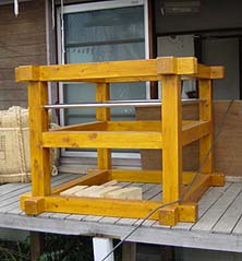 ← 山車の中央に位置する三味線堂 この工事のメインともなる三味線堂の組み立て・塗りが完了し、いよいよ山車への積み上げ作業が行われました。 ユニックを使っての積み上げ作業風景です。→ この三味線堂はできるだけ釘を使わず、長く持つものを作りたいというこだわりをもとに作成されました。出来上がりも綺麗でしょ♪ |