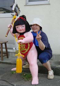 金太郎は人気者!! 山車の中央に位置する三味線堂には、榊(サカキ)などの植物が飾られることが多い中、 緑町では必ず「金太郎」が飾られています。 これは多分、六反田(旧町名)の頃からの名残り(?)・伝統なのではないかと思いますが、 とにかく、大正時代の古い写真にも写っている金太郎さん。 お人形さん自体は変わっても、「金太郎」というコンセプトは不変なのです。 今年は当番町ということもあって、金太郎さんもリニューアル♪ 鉞(まさかり)をもち・見得をきっている金太郎ができあがりました。 この日は、金太郎初お目見えの日! あまりの愛くるしさにほお擦りしたくなりました♪ 緑町の山車は、中央上部の金太郎が目印! 金太郎が見えたら、「緑町だ!!」と思ってくださいね。 |