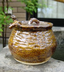 『こんにちは』ってどこから顔を出すのかな? 頭に浮かぶは...鼻楊枝に、ほっかぶり。 やっぱ 壺でしょう。 ということでドジョウ壺を作成。 へい・らっしゃい・らっしゃい・粋のいいドジョウだよぉ〜 と言いたくなるようなドジョウを作ろう! 逃げろ・逃げるんだドジョウ君たち! 早く逃げるんだぁ〜。 と空想しながら作ったら、こうなった。 使う人のことを全く考えていない作品。 また一つ出来上がり…。 (直径11cm 高さ12cm程度、壺部分は伊賀土、ドジョウは信楽土、そば釉) |