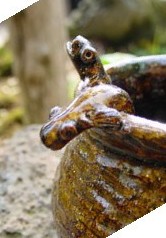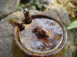 カエルの香炉 | 時期的にはちょうど梅雨。 よし!さっき見たカエルでもくっ付けるか! ちまちま・ちまちま・カエルを作る。 外ではカエルが鳴いている。 カエルは何を食べるんだ? 確か舌って...あったよな。 このカエルには『お香の煙』を食べてもらおう! 霞を食べる高貴なカエル。 お香が立ち込めたときに、舌の先だけ、煙にあたるようにしておこう! ひとり、ニタニタ、カエルを作る。 ほい! 出来た!! そして『ふっ』と気づく…。 このお尻って… やばいっニコチャン大王のお尻になってる! (カエルのお尻は少し尖がっているのです) むむむ…これでもカワイイからいいか。 (直径5.5cm、高さ5cm程度、信楽土、そば釉&織部釉) |