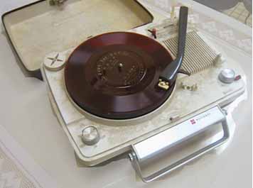 ■「ポータブル電畜」を知っていますか?デンチクと入力しても一発変換できない昔の代物です。 「ポータブル電畜」というのはターンテーブルがシングルレコードサイズで、通常のレコードプレーヤに比べても一回り小さく、アンプとスピーカが内蔵されたもの。電畜は「電気蓄音機」の略称です。写真のように取っ手がついておりスーツケースを小さくしたような外観で、電源さえあればどこへも持ち運べました。 1960年代には、どこの家庭にもありました。裕福な家庭では本格的なステレオセットもあった時代で、レコード鑑賞の入門機のような役割を果たしていたように思います。 |