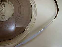 | あればあった方が良いが、無くても特別困らない [用途]テープ保護・両面録音テープのサイドの目印のため、磁気テープの両端に巻いてあります。 テープの一番最初から録音するためのタイムラグ(ヘッドと巻き取りリールとの間隔)を無くす用途も当初はあったようです。 カセットでは巻き取りハブのエッジの切れ込みにテープが接触する事を防止する用途、さらにリーダー自体がクリーニングをする役目にもなっています。 初期は半透明の赤と緑のテープが用いられました。(左画像)色で両面録音した場合のサイドを識別する訳です。その後、メーカーが自社のロゴ入りのリーダーテープを付けるようになり、リーダーテープだけ別売もしていました。 (右画像:上SONY、下SCOTCH) オープン、カセットとも最初から付いているのですが、磁気テープとの接合はスプライシングテープなので、数年で取れてしまう場合もある。1960年代のオープンリールの9割は、現在リールに巻き付けて走行させると取れてしまいます。 磁気テープの最初からいきなり録音してある場合にはリーダーテープを付けないと再生ヘッドと巻き取りリールの間は再生できないので必要になります。 現在リーダーテープはオープン・カセットとも別売品を手に入れることは困難ですが、いずれのテープも不要なテープのリーダーを流用するか、オープンでは一部をカットして別のテープに巻き付ける事も簡単にできます。 |