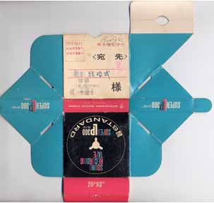 ●右画像は左の箱を分解したモノ。テープの箱の裏面が宛先、切手を貼り付けるようになっており、中に2号リールというカセットより小さいサイズのオープンを入れて、そのまま声の便りとして郵送できるようになっている。 詳細についてはこちらの記事をご覧下さい。 |