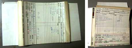 ![]() 左のようなインデックスを作り何枚かコピーしてタイトルを記入。箱に帯のように巻く(写真右)。本当は背(写真では黄ばんだように見える部分)にタイトルを記入するとわかりやすい。当時はアルファベットのゴム印を一つずつ押してインデックスの原稿を作ってコピーしました(^^; |