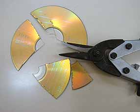| ■音源記録メディアはアナログ、デジタルを問わず、そこそこ頑丈にできていて、普通のカッターやハサミでは切断できない強度を持っています。そのため切った場合の断面はいずれも硬く尖って鋭利な形状になりますので、指にけがをする危険があります。処理する場合は、必ずポリ袋の中で切断しましょう。特にポリカーボネートは非常に鋭利で、尖っているとポリ袋まで破損する恐れがありますので、あまり鋭角に切らないよう注意してください。 ■管理人のオススメはFDであれば、ここで紹介したような工具を使う方法、CD-Rの場合は別頁で解説した表面だけ剥がす方法です。いずれもコストがそれ程かからない方法として紹介しましたが、くれぐれもゴミの分別と処分時の怪我などにはご注意下さい。 |