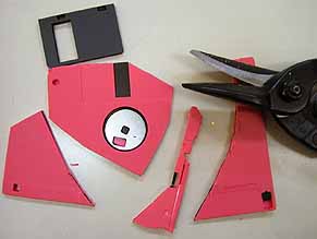 図3 3.5インチFDの場合 次に3.5インチFDを試してみましたが、こちらも力を入れずにズタズタにカットできました。特に分別をして破棄する場合はこの方法が金属とプラスチックに分別できて、よろしいのではないかと思います。 なお、5.5・7インチは、もともと素材が3.5より薄く柔らかいので、より楽に切断できます。 注意 3.5インチFDは内部に細いバネなどの金属類が入っています。飛び散ると危険ですので注意してください。 |