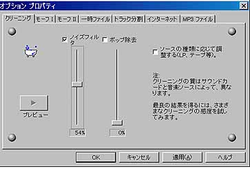 | 「クリーニング」タブで「ノイズフィルター」にチェックを入れ「プレビュー」で対象となる曲を再生します。再生しながらスライドバーを上下して実際に聞きやすいレベルに設定します。これが非常に難しく上げすぎると音質が劣化してAMラジオのような音質になってしまう。決定したら他のHD内のファイル処理同様録音ボタンを押すと処理されます。 ※現実的には私はほとんど利用しない。ソノシートであまりにもノイズだらけで音声が聞き取りにくい程ひどいものしか処理しませんでした。スクラッチノイズ自体は私は気にする方ですが元の音源の音質がひどく劣化するのがイヤなのでそのまま録音しています。 |