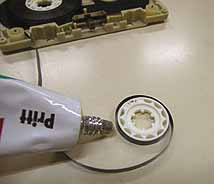 | 全てのカセットで磁気テープをツメとリールの間に、はめ込めれば問題ないのですがツメの形状がメーカーや品番により異なり、管理人の分解した古いテープ(70年代のTDK・FUJI)では上手くできませんでした。 上記画像のように強く押し込んだらツメが割れてしまいました(-_-;) こうした古いカセットは、近年の新しいタイプのカセットを、ひとつ捨てるつもりでリールハブだけ交換すれば解決します。 あいにく、捨てても良いカセットが見あたらない場合は、プラスチックを接着できるボンドをリール一周薄く付けて(ハブの黄色の部分)テープを巻き付けます。[下の左画像] 絶対に外側へ接着剤が着かないよう注意しましょう。 |
