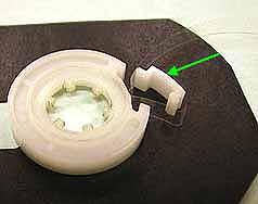以下の(2)(3)はリーダーテープを取り去って、直接リールハブに録音テープを巻き付ける方法です。(2)の方法は比較的新しいカセット、(3)は古いカセットが対象となります。 ←カセットのリールハブにはリーダーテープを固定するための切れ込みがあり、そのままハサミで切っても良いのですが、このハドメ(緑の←部分)は横にずらせば簡単にリーダー部分を取り去ることができます。 それなら、この部分に磁気テープをそのまま同じようにはめ込むだけでは無いかと思われるでしょうがカセットの製造年代によって若干その大きさが異なっています。大抵古いモノはハドメの長さが短く、新しいモノはやや長い。若干の違いのようですがこの差が作業に大きな影響を及ぼします。 結論から言えば古いカセットではうまくはめ込めませんので、別の方法で止める必要があります。 |