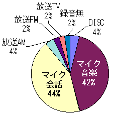 [録音内容] マイク録音の会話と演奏が半々といった処です。残り部分やテープの最初の一部にラジオやテレビの録音が入っているテープも多い。 会話テープはカセットが普及する以前の60年代のものが中心です。特に家族の会話録音は、現在では鬼籍に入られた身内の方もおられるでしょうからデジタル化して残しておきたい録音の筆頭に掲げられる貴重なものではないでしょうか。 ※個人の無伴奏独唱や子供の歌は会話と混合している部分が多いので「会話」として区分。ラジオ放送は本人(学校)出演コンクールなどが中心。今回片面のみの集計なので「録音無」もあります。 |