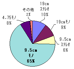 | [録音速度・チャネル] 録音速度は9.5cmが全体の7割を占めています。 サウンドはモノラルが大半でモノラル録音の場合は2トラック、ステレオでは4トラックという形態です。 僅かですが19cm2トラックモノラル、放送局用フルトラック録音もありました。2トラック38cmステレオの申し込みも若干ありました。 |