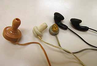 右の黒いイヤフォンが現在主流のステレオ型です。 画像左端が最も昔からあるタイプでこれは鉱石ラジオセットの付属品。左から2番目はテレビの付属。この二つは全部プラスチックでできており、いかにも安っぽい(^^; 3番目はSONYの刻印があったので昔のラジカセの付属か?こちらは耳の挿入部分がやわらかいビニール樹脂になっています。 旧式とステレオタイプの違いは音質・デザインだけでなく装着感も全く異なります。旧式タイプは耳の穴に差し込むタイプで「耳栓」方式の密閉型です。 片方の耳に装着するだけなので完全な密閉感は無いのですが、両耳に装着するステレオイヤホンは非密閉型でないと外界の音が遮断され不都合があります。かといって音が他人に漏れるのも迷惑だという事で耳の穴のデッパリ?に装着する方法を考えた人はエライ(^o^) 現在ではステレオHiFi用途でも密閉タイプがかなり出回っていますが、どうも私は耳垢がついたり不潔に感じて耳栓タイプは昔からなじめませんでした。コンタクトレンズを使用した時もなじめず結局眼鏡のままです。目や耳に装着するものは機能以上に好みがありますね。。。 ※このトピックスは2004.8→アテネ五輪→シンクロナイズドスイミング→鼻栓→耳栓→イヤホンというイメージが浮かんだものです(爆) |