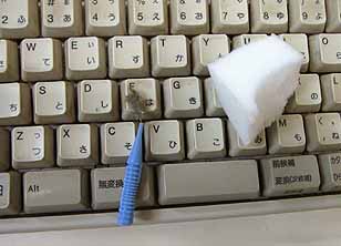 そこでキーボードの掃除に効果抜群のお役立ちグッズの紹介。 左の歯間ブラシ。自分の歯のお掃除をした後の使い古しをきれいに洗って乾かしておく(セコイ(^^;) これでキーの溝に沿って動かすと綿埃や髪の毛など溝に入り込んだゴミがきれに取れます。毛先に付いたゴミを落とさないようティッシュを用意してまめに取るのがコツ。 そして画像右の白い物体は「メラミン樹脂」というスポンジみたいなものです。これはキーボードの清掃に驚くほどの効果を発揮します。特にキーのくぼんだ部分の清掃に効果抜群。スポンジ感覚で水を少量含ませて軽くこするだけです。 それまでOA機器専用などと書かれた洗剤やアルコール系の洗浄液を綿棒にしみこませて清掃していたがきれいに汚れが落ちませんでした。2〜3年前試しに使ったところ本当に魔法のように汚れが取れて大感激!出たばかりの頃は結構高価でしたが、最近では100ショップでも売ってます。おそらく、どの家庭にも常備していると思いますので是非お試しあれ。 キーボードも種類が多様でメラミン樹脂でも落としづらいものもあるかも知れません。また、キーボードカバーを利用している方はいずれも不要です(^^; ただ歯間ブラシはパソコンのコネクター類の溝やファンにたまったホコリを取るのにも効果があります(^o^) |
