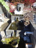 田町に入ると右に「突抜井戸」のある家があり、声をかけて庭に入れてもらった。三段式の自噴井戸で、今はお風呂に水を入れているので、勢いがないが普段は勢いよく水が出ているとのことだった。飲ませていただいたが、水は暖かかった。冬は温かく、夏は冷たいとのこと。近所でも何軒かこの井戸はあるとのことだった。水質検査もしていて、飲料水になるという証明書も見せていただいた。